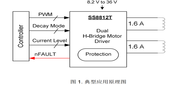 SS8812T 為打印機(jī)和其它電機(jī)一體化應(yīng)用提供一種雙通道集成電機(jī)驅(qū)動方案。SS8812T 有兩路 H 橋驅(qū)動,每個 H 橋可提供最大輸出電流 1.6A